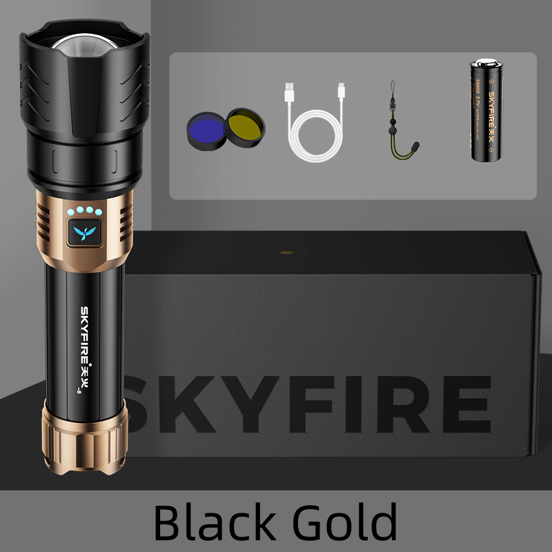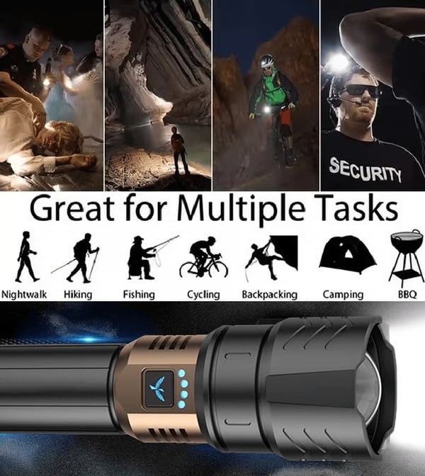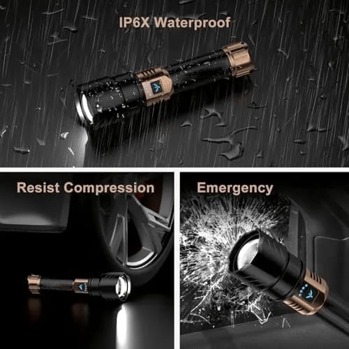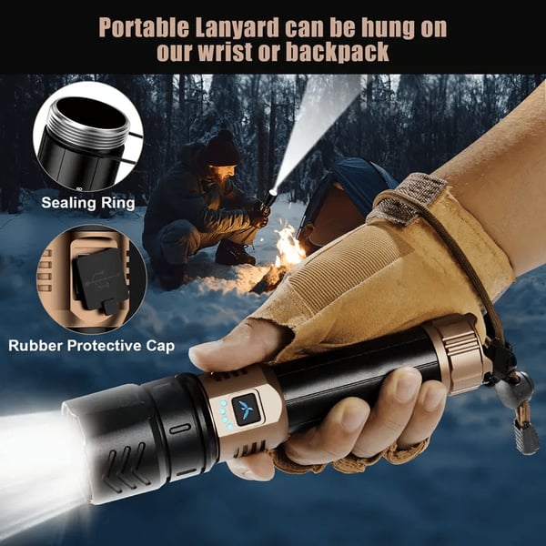 This high-quality aluminum alloy flashlight is durable, with a comfortable grip and rapid heat dissipation. Ideal for camping and home use, it's a reliable lighting companion. Waterproof &Dustproof Design: equipped with life-level waterproof protection, the charging port includes a rubber plug for dust-proofing.