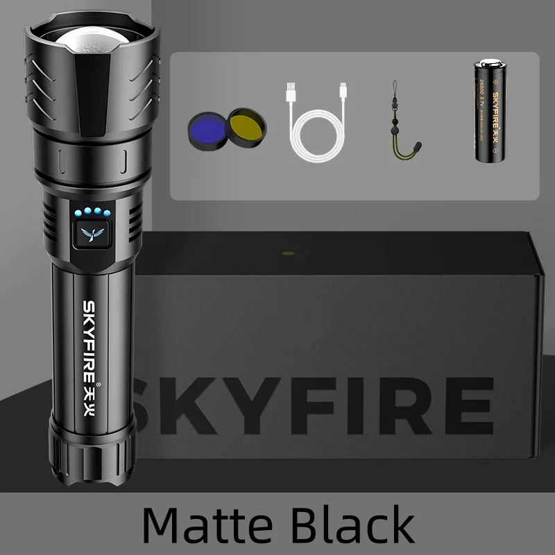 This ensures durability in various conditions. The flashlight supports emergency reverse charging, acting as a power bank during critical moments. A focusing head allows for emergency fire-making in the wild, adding versatility to its functionality. Easy Operation & Modes. With six mode settings, operation is simple and fast.